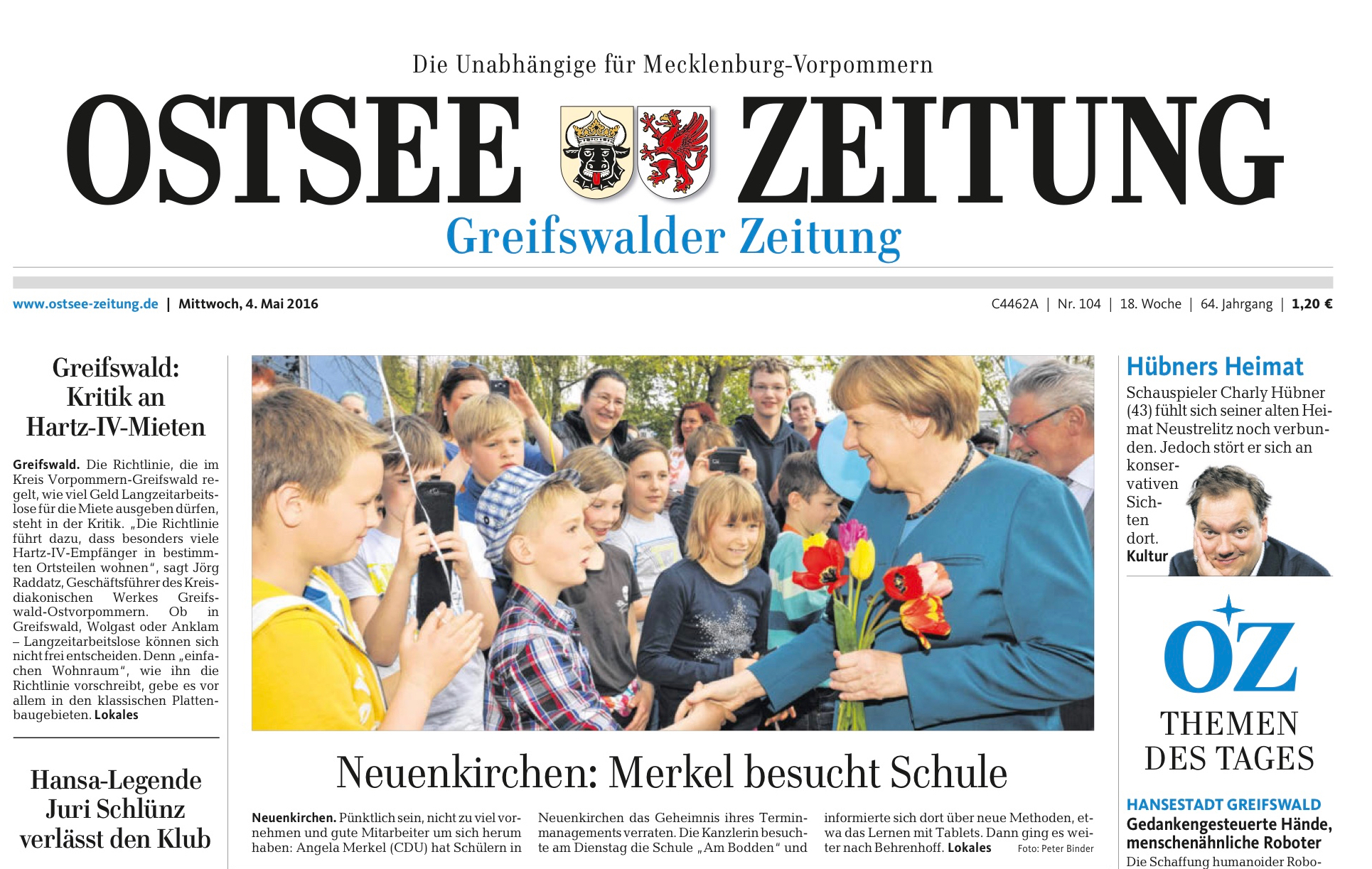 Der Besuch der Bundeskanzlerin am 3.5.2016 in unserer Schule sorgte nicht nur bei uns vor Ort für viel Freude und Aufregung sondern zog auch das Interesse der Medien auf sich. Mit blau-weißen Luftballons, den Farben Vorpommerns, wurde die Bundestagsabgeordnete Dr. Angela Merkel in ihrem Heimatwahlkreis empfangen. Alle Anwesenden waren von der von der Ausstrahlung und der Lockerheit Angela Merkels begeistert. Schnell war der Kontakt zu den Schülern und Lehrern hergestellt, wobei sich die Kanzlerin lobend über die Aktivitäten an der "Schule am Bodden" äußerte, sowohl vom breiten Angebot für die Schüler als auch dem zukunftsorientierten Unterrichten mit iPads in einer elternfinanzierten 1-zu-1 Lösung ab Klasse 7.
