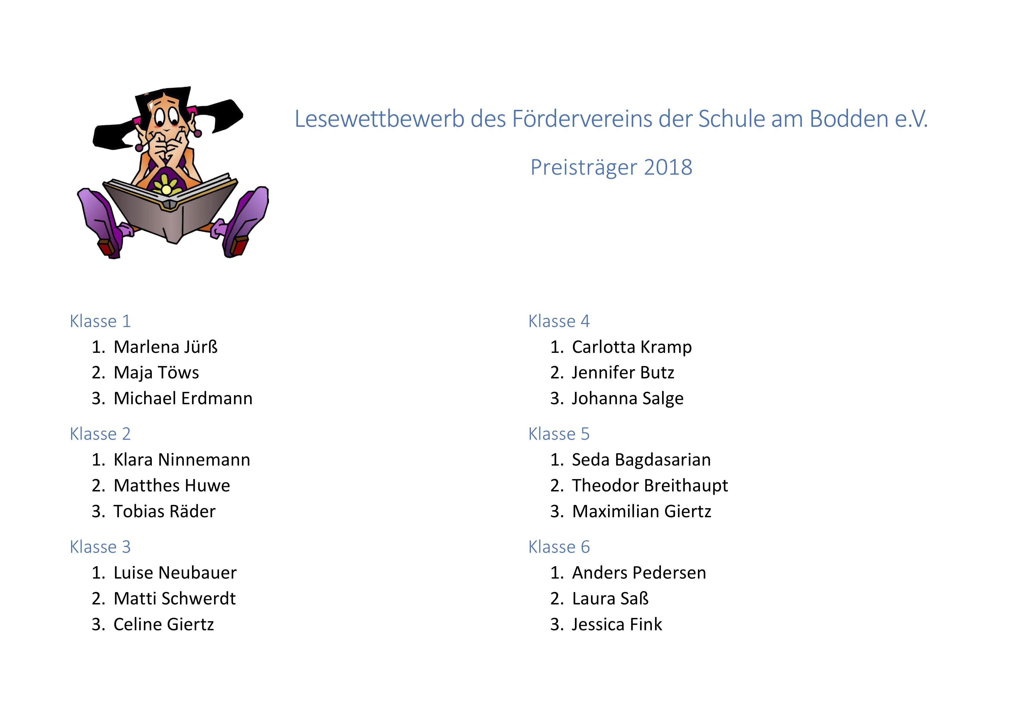 Der Förderverein der Schule am Bodden e.V. lud am Sonnabend, den 28.4.2018, zu seinem diesjährigen Lesewettbewerb ins Grundschulgebäude ein. Die besten Leser der Klassen 1 bis 6 stehen fest. Wir gratulieren allen Siegern.
