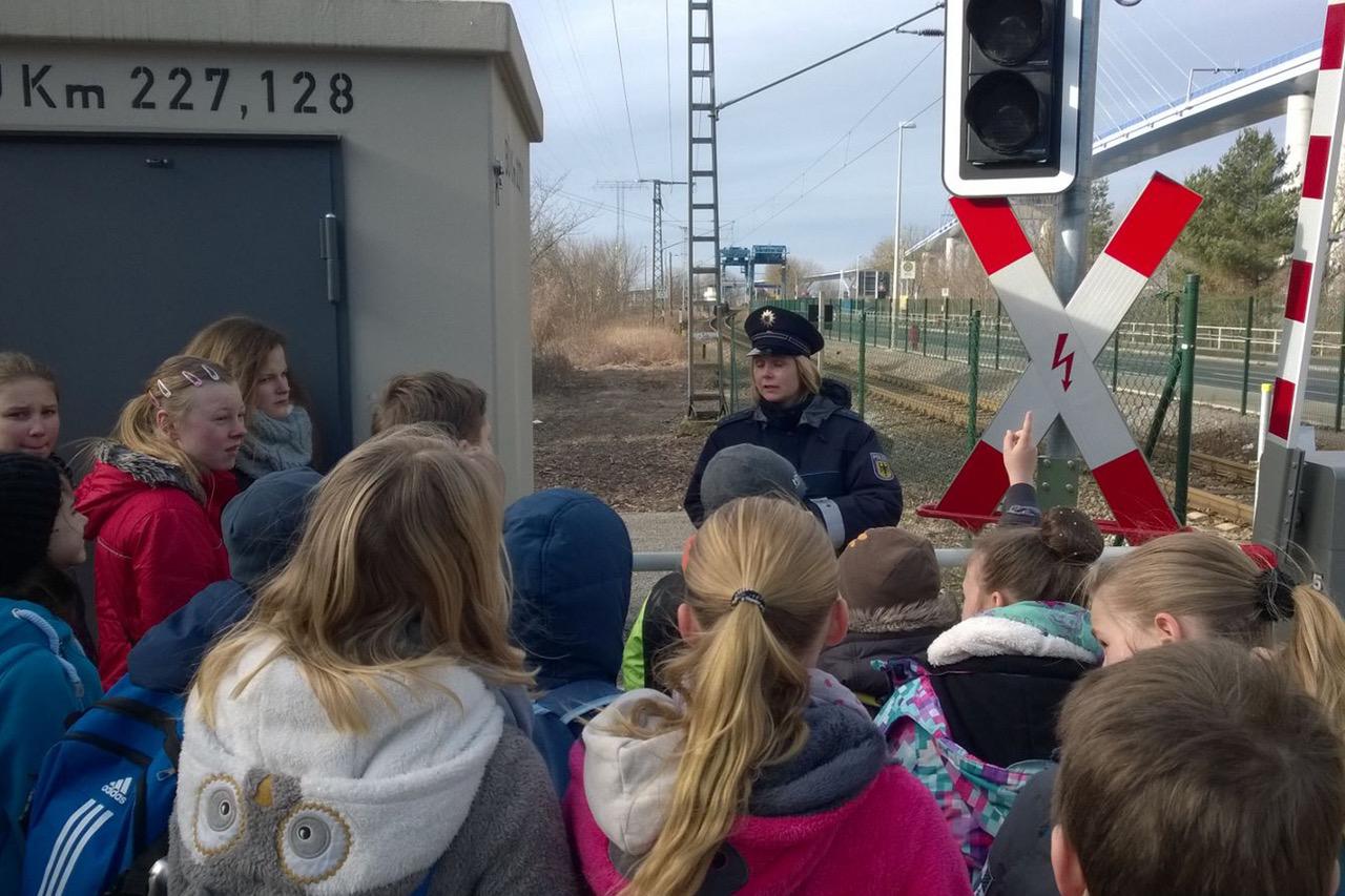 Am 15.3.2016 besuchten wir, die Klasse 5b der Schule am Bodden die Polizeiwache am Dänholm. Um 8.00 Uhr trafen wir uns alle am Hauptbahnhof Greifswald und sind dann mit der UBB nach Stralsund gefahren. Als wir ankamen, sind wir über die alte Stralsunder Klappbrücke gegangen. Am anderen Ende der Brücke warteten schon zwei Polizistinnen, die dann mit uns zu einer Zugschiene auf der anderen Straßenseite gelaufen sind. An dieser Zugschiene haben wir darüber geredet, was an ihr für Schilder stehen, wie zum Beispiel das Andreaskreuz oder das Übergangsschild.